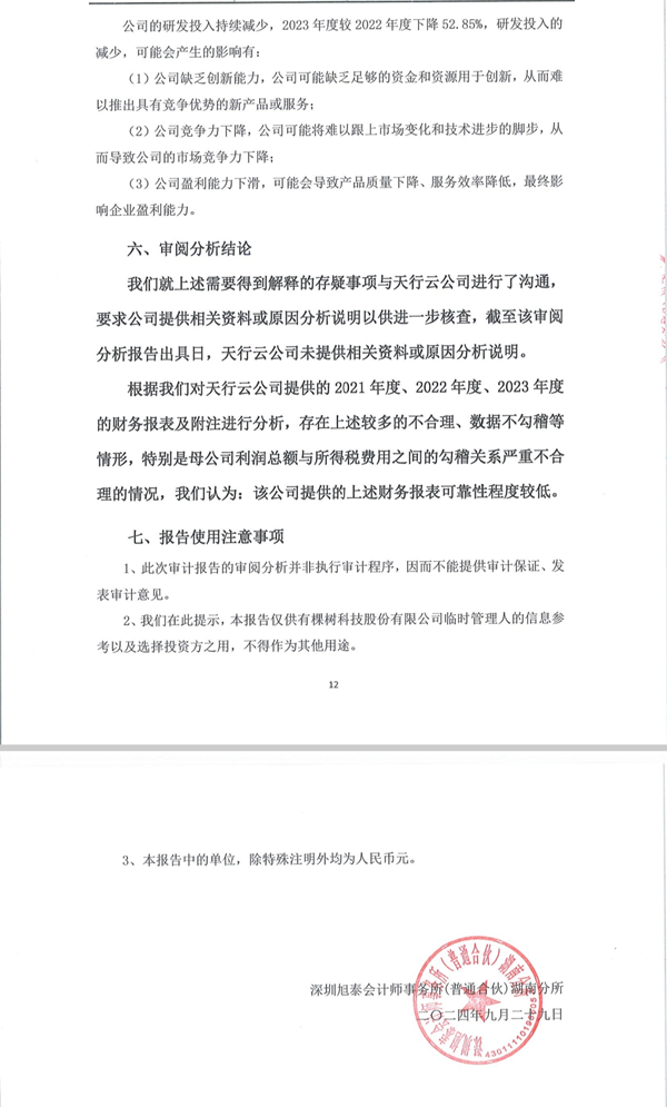 王维与天行云的争议,远不止于业绩承诺的违约。早在重整期间,第三方会计师事务所对天行云的尽职调查就已发出预警。一份《关于深圳市天行云供应链有限公司审计报告的审阅分析报告》指出,天行云2021至2023年的财务报表存在“较多不合理、数据不勾稽”问题,尤其是母公司利润总额与所得税费用的勾稽关系严重不合理,最终得出“财务报表可靠性程度较低”的结论。