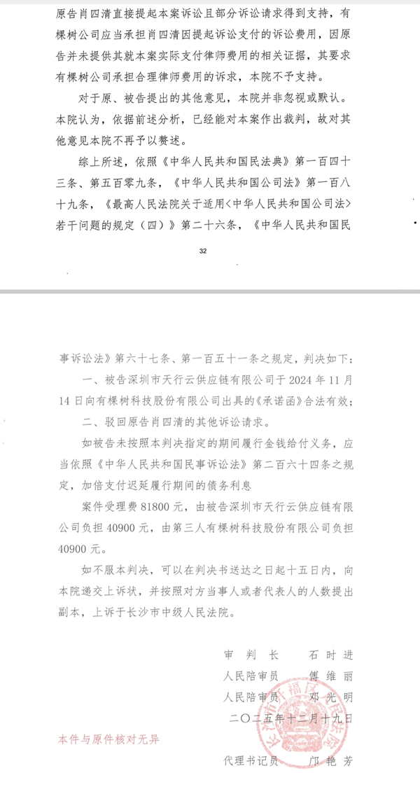 这一反转让有棵树原实控人肖四清忍无可忍,2025年6月10日,肖四清向长沙中院提起诉讼,要求确认《承诺函》合法有效并强制履行。