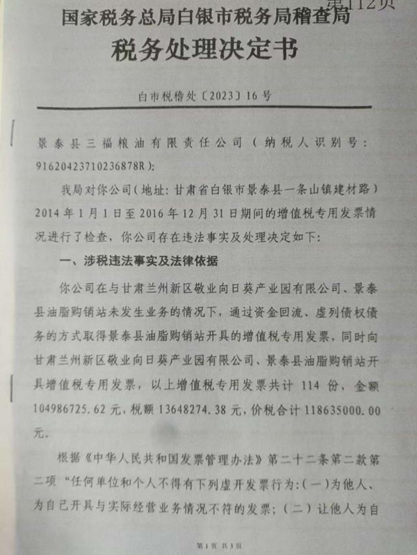 2022年9月15日,景泰县公安局决定对景泰三福粮油骗取贷款案立案侦查。