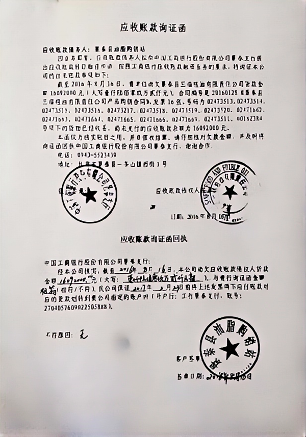 在办理保理贷款时,工行景泰支行出具了一张应收账款询证函,当时是自己到银行取来,甘永义直接盖的油脂购销站的章,然后去敬业向日葵公司盖的章,绝对不是银行的人去办的。